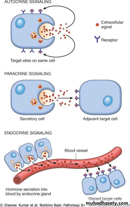 or overt great distances (endocrine signaling e.g. a hormone is released into the blood stream and act on the target cells at a distance).