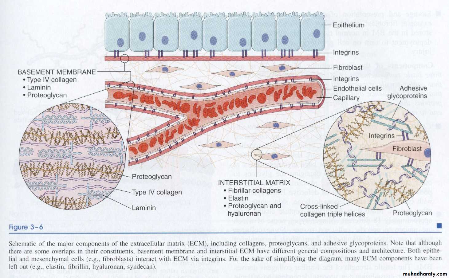 These include collagens, proteoglycans, and adhesive glycoproteins. Note that although there are some overlaps in their constituents, basement membrane and interstitial ECM have different general composition and architecture. Both epithelial and mesenchymal cells (e.g. fibroblasts) interact with ECM via integrins.