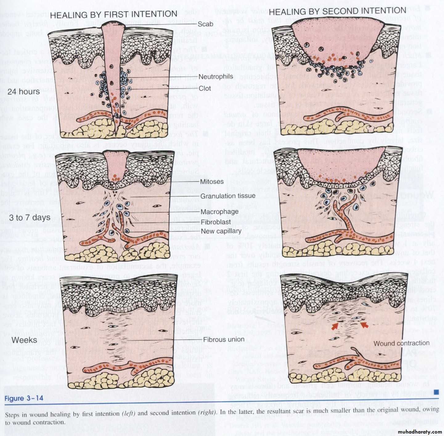 One of the simplest example of the wound repair is the healing of a clean uninfected surgical incision approximated by surgical sutures. This is referred to as primary union or healing by first intention.The incision causes only focal disruption of the epithelial basement membrane continuity and death of a relatively few epithelial and connective tissue cells. As a result, epithelial regeneration predominates over fibrosis. a small scar is formed but there is minimal wound contraction.