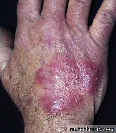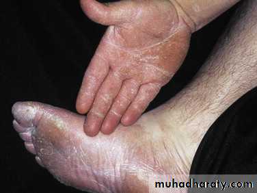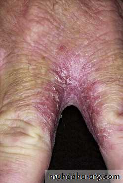 Tinea of the dorsal aspect of the hand (tinea manuum) has all of the features of tinea corporis.Tinea of the palm has the same appearance as the dry, diffuse, keratotic form of tinea of the sole.