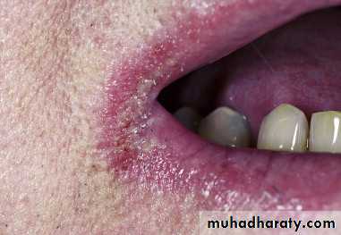 Continued irritation by the presence of saliva at the mouth angles leads to eczematous inflammation.