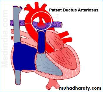 Functional closure of the ductus normally occurs soon after birth, but if the ductus remains patent when pulmonary vascular resistance falls, aortic blood is shunted into the pulmonary artery.