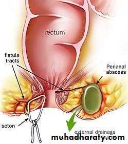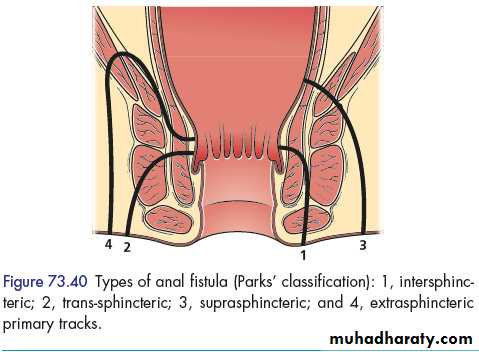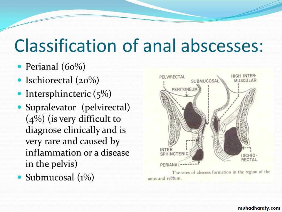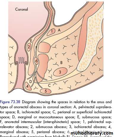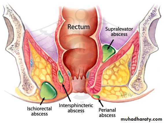 , may spread caudally to present as a perianal abscess, laterally across the external sphincter to form an ischiorectal abscess or, rarely, superiorly above the anorectal junction to form a supralevator intermuscular or pararectal abscess
