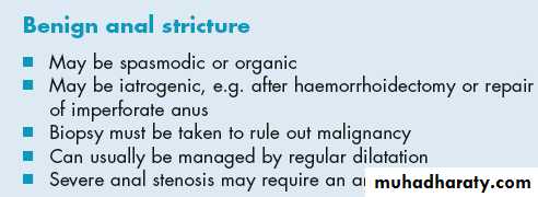 Spasmodic An anal fissure causes spasm of the internal sphincterOrganic Anal stenosis is a rare but serious complication of anorectal surgery, Other causes include trauma, inflammatory bowel disease, radiation