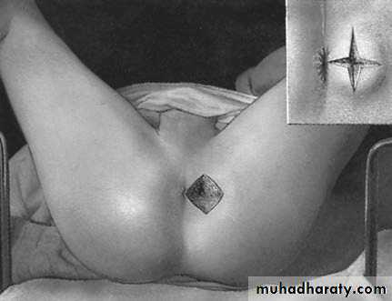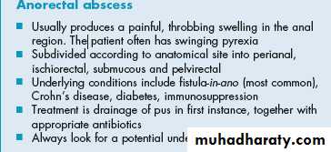 usually associated with a short (2–3 day) history of increasingly severe, well-localised pain and a palpable tender lump at the anal margin.Examination reveals an indurated hot tender perianal swelling.