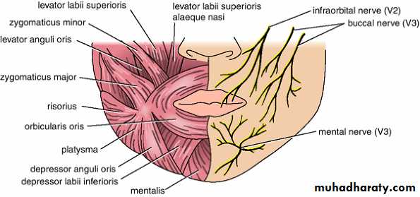 Cheek: The buccal nerve, a branch of the mandibular division of the trigeminal nerve (the buccinator muscle is innervated by the buccal branch of the facial nerve)