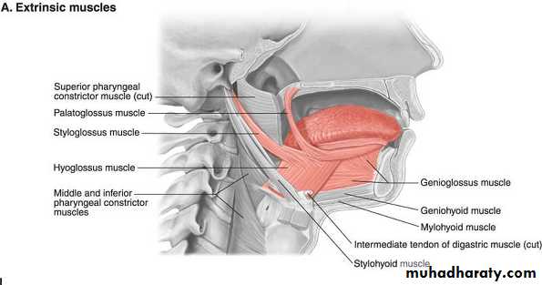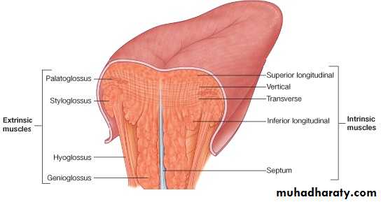 • The muscles attach the tongue to the styloid process and the soft palate above and to the mandible and the hyoid bone below.• The tongue is divided into right and left halves by a median fibrous septum.