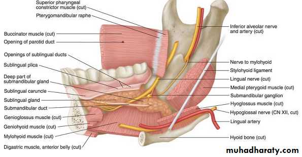 • The submandibular duct of the submandibular gland opens onto the floor of the mouth on the summit of a small papilla on either side of the frenulum of the tongue