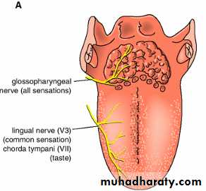 • Posterior third: Glossopharyngeal nerve (general sensation and taste)
