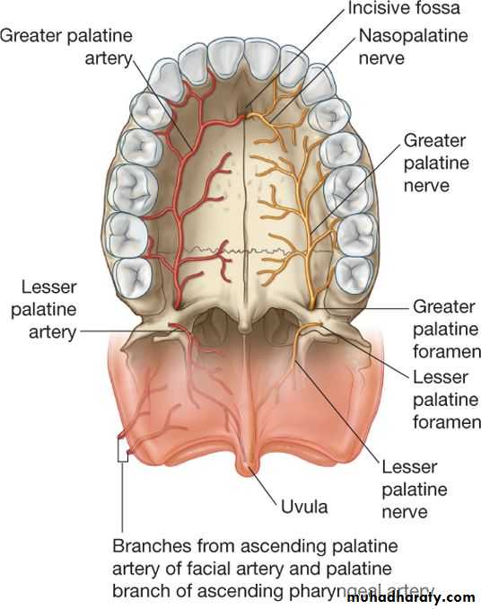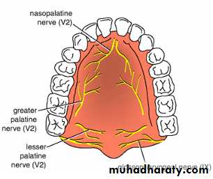• The greater and lesser palatine nerves from the maxillary division of the trigeminal nerve enter the palate through the greater and lesser palatine foramina.• The nasopalatine nerve, also a branch of the maxillary nerve, enters the front of the hard palate through the incisive foramen.
