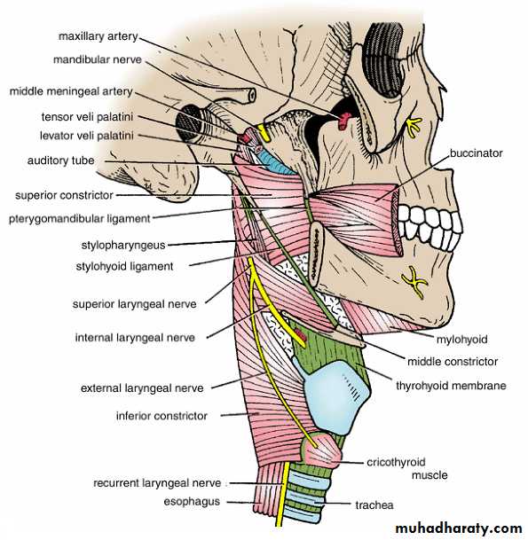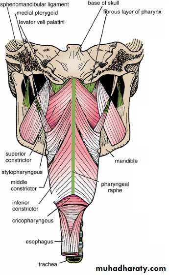 • The three constrictor muscles extend around the pharyngeal wall to be inserted into a fibrous band or raphe that extends from the pharyngeal tubercle on the basilar part of the occipital bone of the skull down to the esophagus.