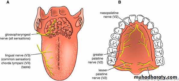 Roof: The greater palatine and nasopalatine nerves from the maxillary division of the trigeminal nerve