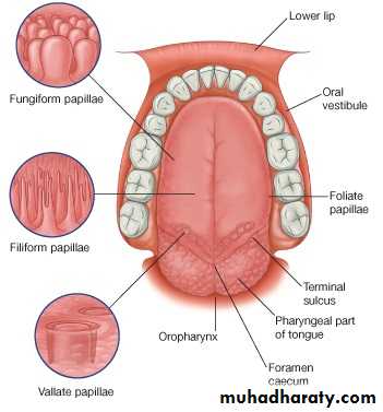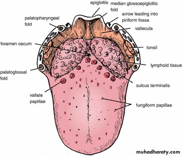 • The mucous membrane of the upper surface of the tongue can be divided into anterior and posterior parts by a V-shaped sulcus, the sulcus terminalis.
