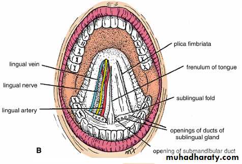 • The mucous membrane on the inferior surface of the tongue is reflected from the tongue to the floor of the mouth. In the midline anteriorly, the undersurface of the tongue is connected to the floor of the mouth by a fold of mucous membrane, the frenulum of the tongue.