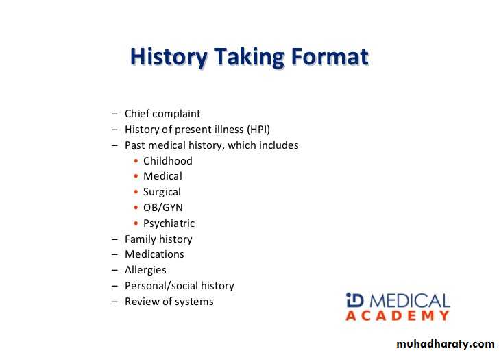 The art of taking an accurate case history is probably the most important single step in the diagnosis of medical or surgical condition .History taking should be systematic , using special set or sequences . During history taking the clinician or the dental surgeon listen to the patient`s story or talks and list the symptoms in order of severity or importance . By patient`s words .