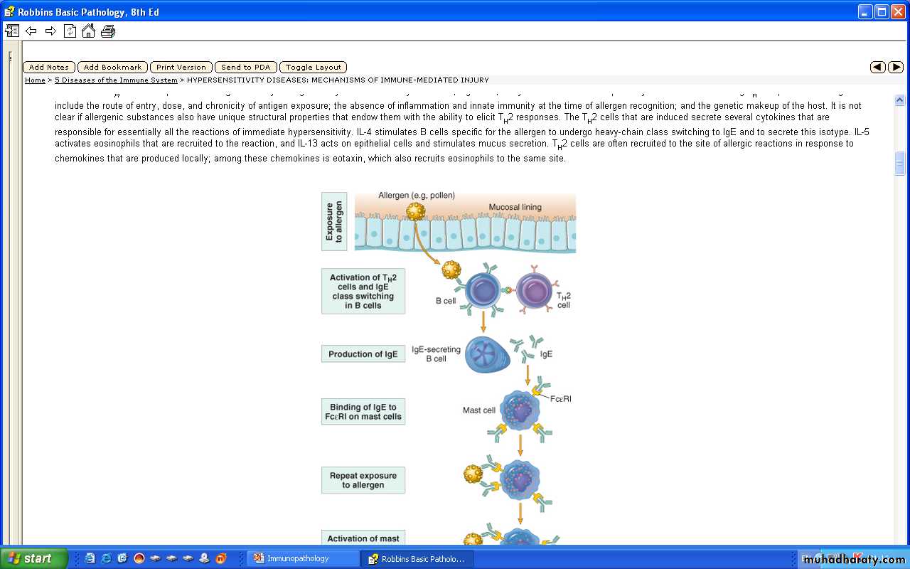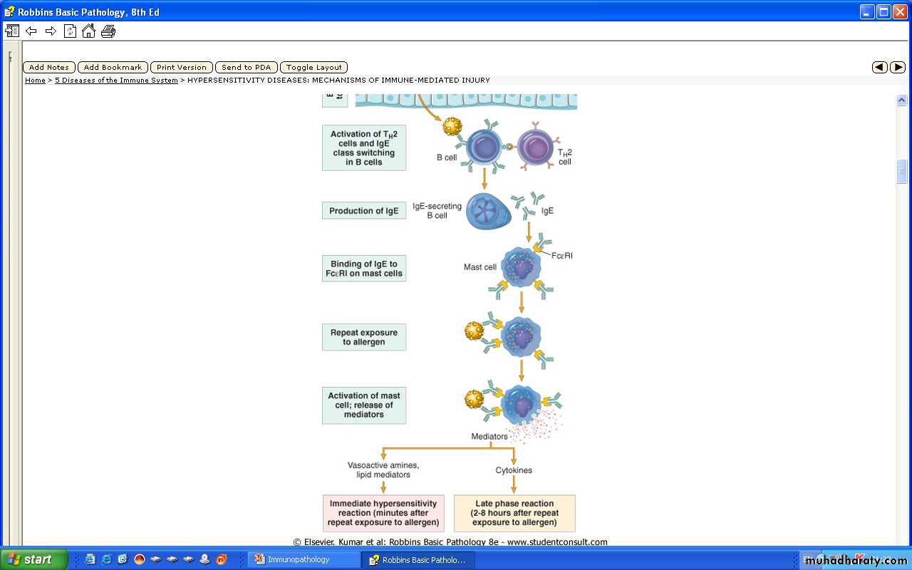 Systemic anaphylaxis e,g, Penicillin, bee venomSequence of events in immediate (type 1) hypersensitivity Immediate hypersensitivity reactions are - initiated by the introduction of an allergen, - which stimulates TH2 responses & IgE production. - IgE binds to Fc receptors on mast cells, -& exposure to the allergen --activates the mast cells to secrete the mediators that are responsible for the pathologic manifestations of immediate hypersensitivity