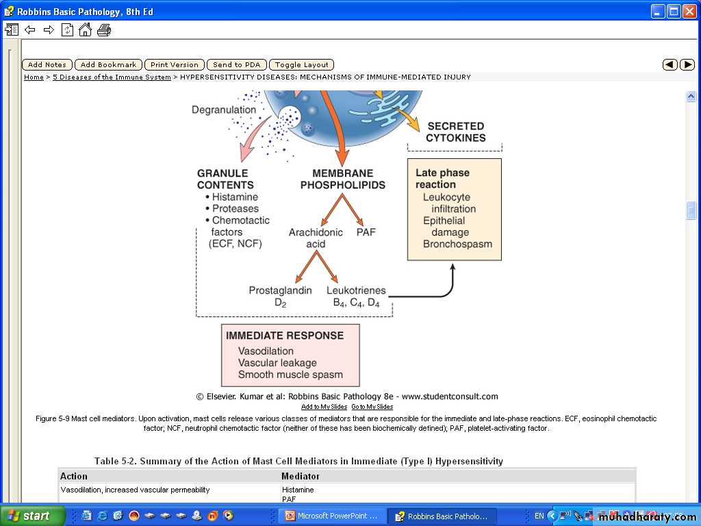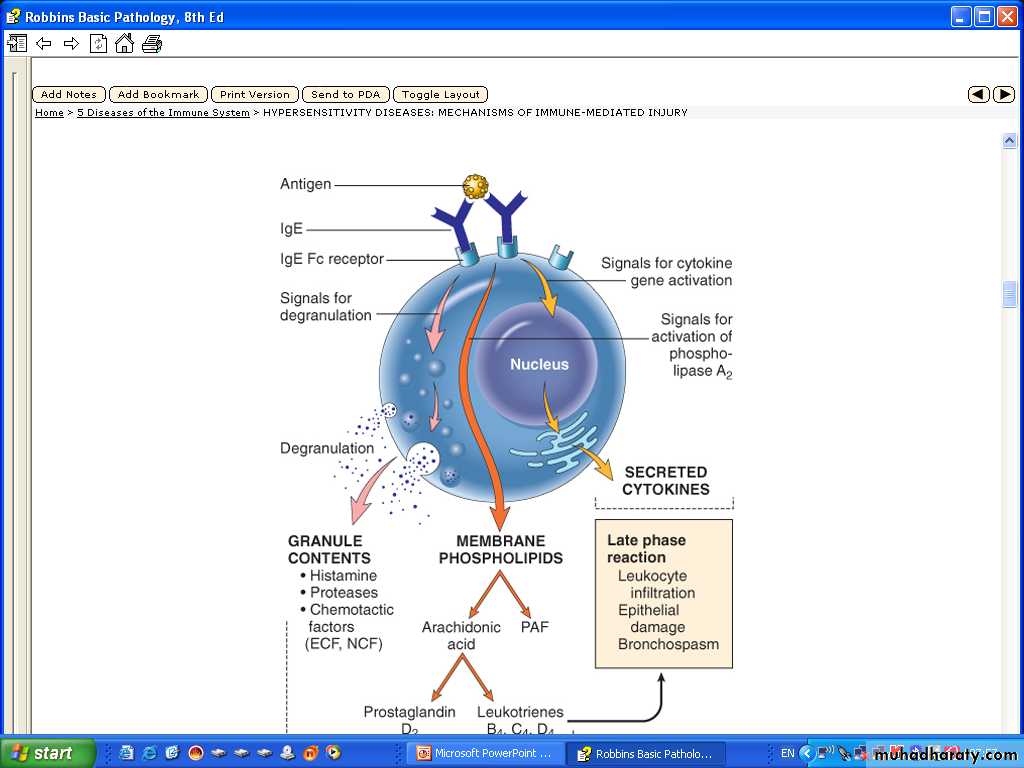 1- Vasoactive amine released from granule stores :e,g, Histamine, 2-Newly synthesized lipid mediators e.g, Prostaglandins & Leukotrienes3- Cytokines these are important for the late phase e.g. TNF & Chemokines for leukocytes ,IL-4 & IL-5