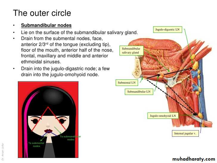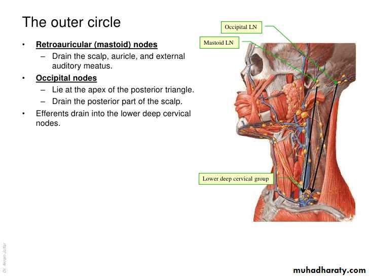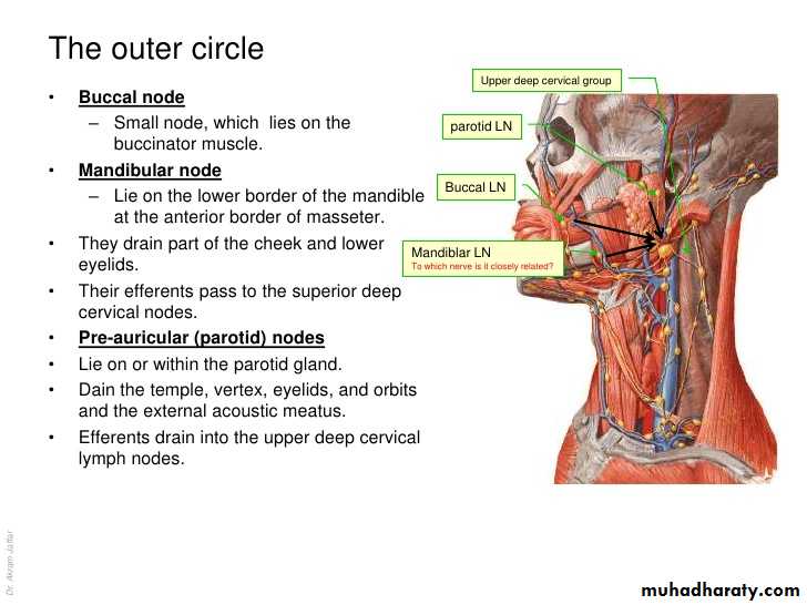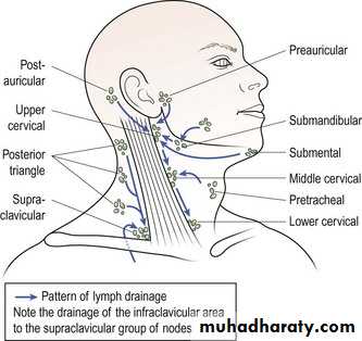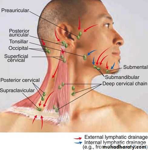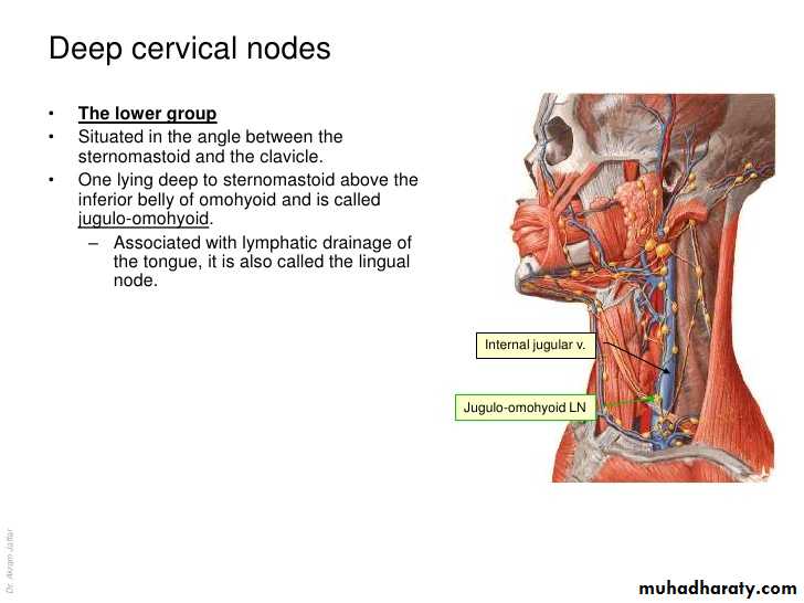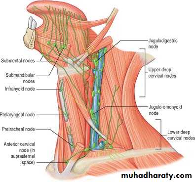 • > superficial (along external jugular vein)• > deep (along internal jugular vein)