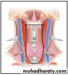 VI Anterior/medial to the common carotid arteries from the level of the hyoid to the manubrium Anterior cervical nodes, pre- and paratracheal