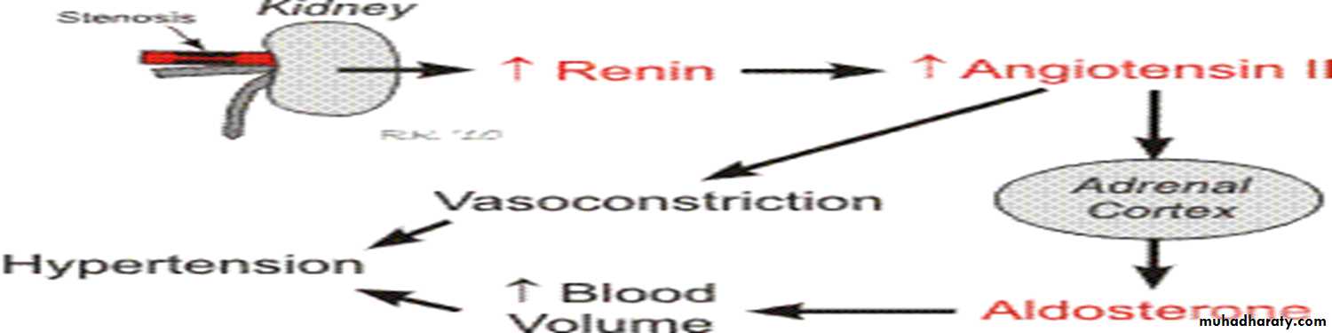 Renal artery stenosis results in a reduction in renal perfusion pressure, which activates the renin–angiotensin system, leading to increased circulating levels of angiotensin II. This provokes vasoconstriction and increases aldosterone production by the adrenal, causing sodium retention by the renal tubules.Significant reduction of renal blood flow occurs when there is greater than 70% narrowing of the artery