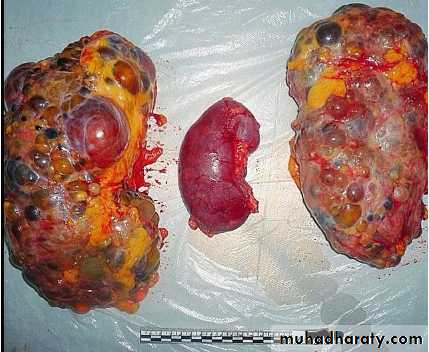 ADPKD: It is an inherited multisystemic disease characterized by multiple cyst formation in both kidneys and other organs (like liver, pancreas or ovaries) with extrarenal noncystic manifestations such as mitral valve prolapse, intracranial aneurysms, and hernias.It is a common condition, with a prevalence of approximately 1 : 1000, and is inherited as an autosomal dominant trait. Small cysts lined by tubular epithelium develop from infancy or childhood and enlarge slowly and irregularly.