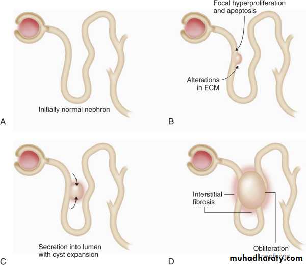 A to D, Steps involved in cyst formation: schematic of the sequence of events leading to renal cyst formation. Note that this process occurs hundreds or thousands of times during the natural history of polycystic kidney disease. ECM = extracellular matrix.