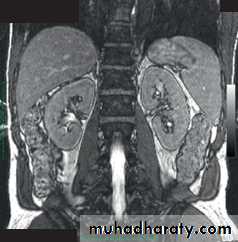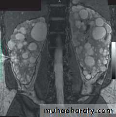 MRI images of the kidneys. A Normal kidneys. B Polycystic kidneys; although the kidney enlargement is extreme.