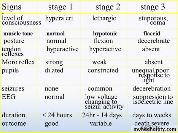 At delivery, the presence of meconium-stained amniotic fluid is evidence that fetal distress has occurred. At birth, affected infants may be depressed and may fail to breathe spontaneously. During the ensuing hours, they may remain hypotonic or change from a hypotonic to a hypertonic state, or their tone may appear normal.