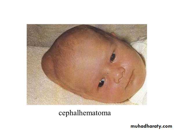 Is a subperiosteal hemorrhage, it is always limited to the surface of one cranial bone, it does not cross the suture lines. No discoloration of the overlying scalp. the swelling starts after several hours after birth. Occasionally an underlying linear skull fracture is associated with cephalhematoma.It takes 2wks to 3 mo to be resorbed.