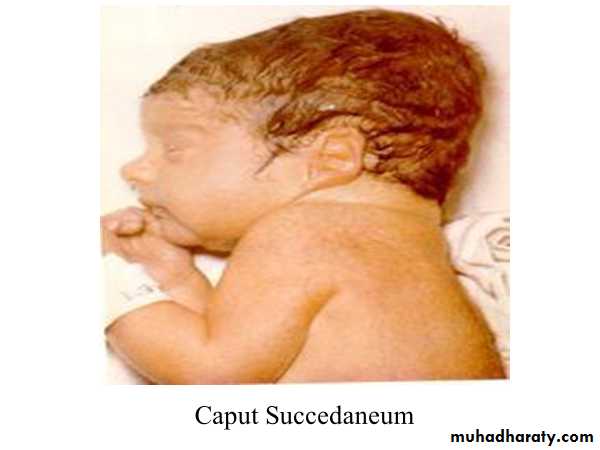 Caput succedaneum:Is a diffuse sometimes ecchymotic edematous swelling of the soft tissues of the scalp involving the portion presenting during labor. It appear during the first hours or immediately after birth.