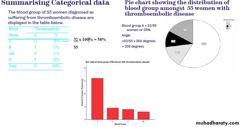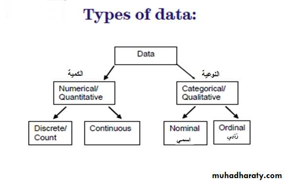 When we first collect data for some project, it will usually be in a ‘rawخام ’ form . That is, not organized غير منظمهin any way, making it difficult to see what’s going on. Descriptive statistics is a series of procedures designed to illuminateالقاء الضوء the data, This may mean sorting the data by size; perhaps putting it into a table, maybe presenting it in an appropriate chart, or summarizing it numerically; and so on.An important consideration in this process is the type of variable concerned. The data from some variables are best described with a table, some with a chart, some, perhaps, with both. Other variables, a numeric summary is more appropriate.