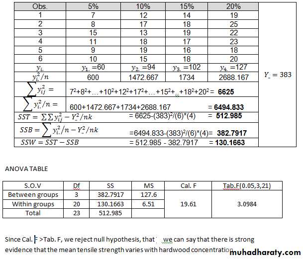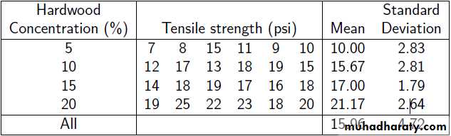 2- A paper manufacturer makes grocery bags. They are interested in increasing the tensile strength of their product. It is thought that strength is a function of the hardwood concentration in the pulp. An investigation is carried out to compare four levels of hardwood concentration: 5%, 10%, 15% and 20%. Six test specimens are made at each level and all 24 specimens are then tested in random order. The results are shown below