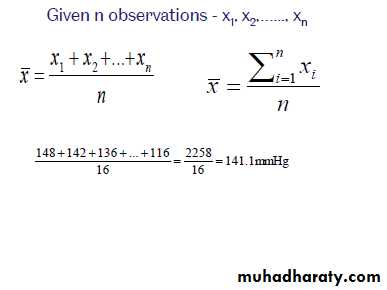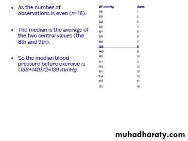 The median is thus a measure of central-ness. As an example of the calculation of the median, suppose you had the following data on age (in ascending order of years), for five individuals:30 ,31, 32, 33, 35. The middle value is 32, so the median age for these five people is 32 years. If you have an even number of values, the median is the average of the two values either side of the ‘middle’. If you have n values arranged in ascending order, then : the median = 1/2(n + 1)th value.