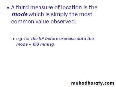 A summary measure of location is a value around which most of the data values tend to congregate or center. The most famous three measures of location we are discussed are : the mode; the median ; and the mean. The choice of appropriate measure to be used; depends on the type of dataThe mode