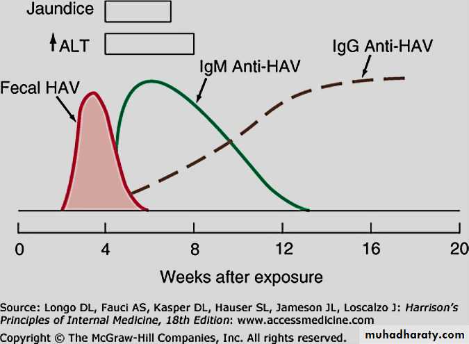 HAV is present in stool for 2 weeks before and 2 weeks after onset of symptoms with maximal infectivity just before the onset of jaundice.