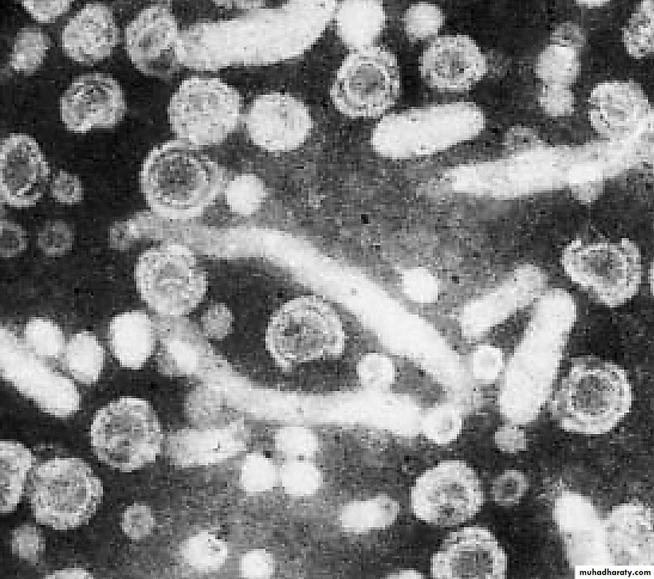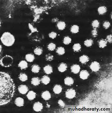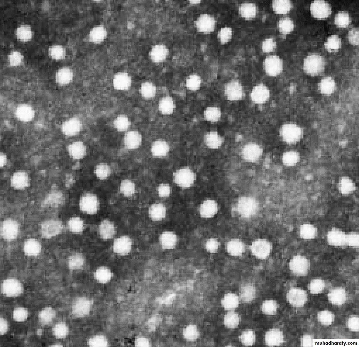 Electron microscopy of hepatitis A virions in feces. These are shown as 27 nm spheres. ( × 250 000.)