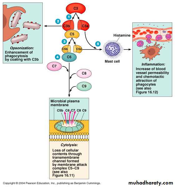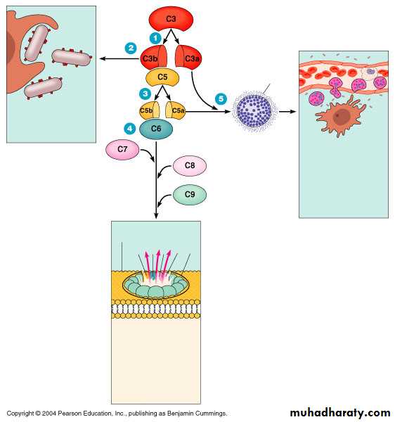 When an additional C3b binds to the C3 activation complex it converts it into a C5 activation complex.The C5 activation complex cleaves C5 into C5a and C5b.