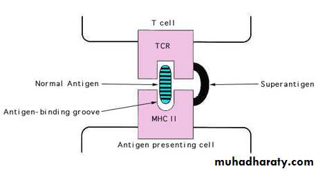 Bacterial superantigens act by binding to both the MHC protein and the TCR at positions outside the normal binding sitesuperantigens can interact with large numbers of cells, stimulating massive T-cell activation, cytokine release and systemic inflammation