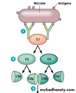 Once C1 is activated, it activates 2 other complement proteins, C2 and C4 by cutting them in halfC2 is cleaved into C2a and C2b