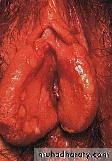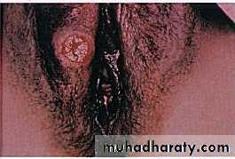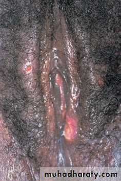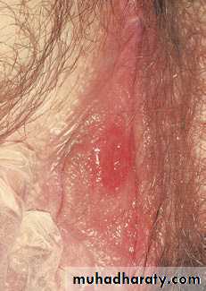 • Discrete papules on the skin or vulva which enlarge and form beefy red painful ulcers