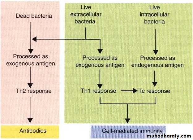 The type of immune response stimulated by bacteria depends on whether the bacteria are live or dead and whether they grow inside or outside cells.