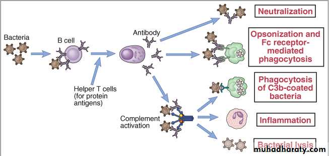 Humoral immunity: block infection, eliminate microbes and neutralize toxins