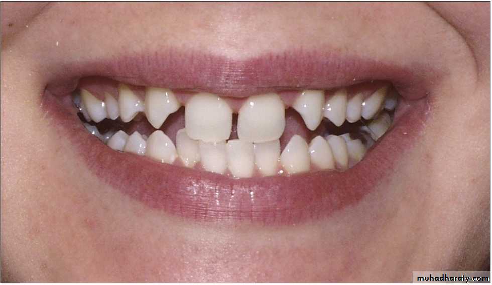 Congenital missing of the teeth are more frequently than that of supernumerary teeth. The patient with missing teeth have deformities in tooth size and shapes such as peg lateral are more frequent.3. Loss of permanent teeth spacing, drifting, shifting in midline