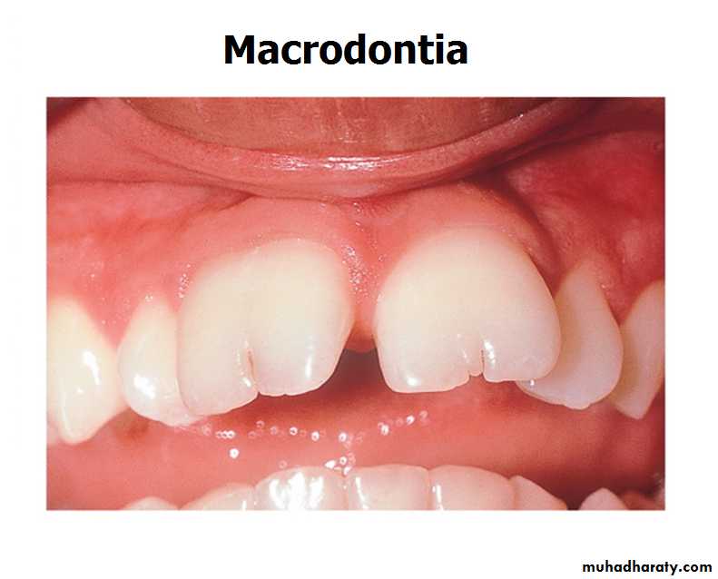 2. Excessive large or small teeth ( macrodontia or microdontia)The size of teeth is largely determined by hereditary. So their will be great variation from individual to another. So it may affect the dental arch by possibility to produce crowding in cases of largely teeth than with small one, and also producing some spaces in case of small teeth and several observation are made by several authors on tooth size and their correlation between tooth size and dental arch (Moores study).