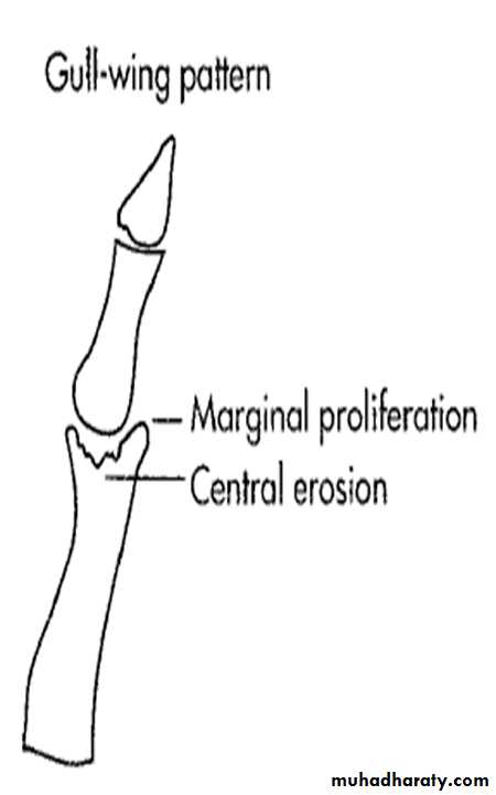 * Gull-wing pattern: secondary to central erosions and Marginal proliferation osteophytes .