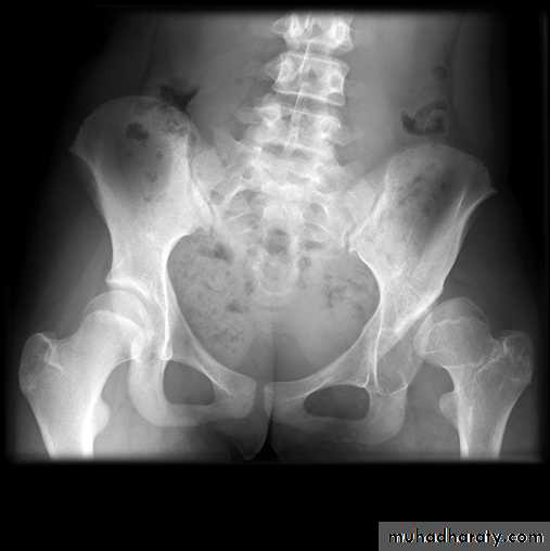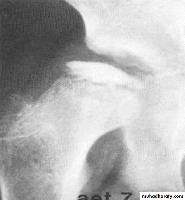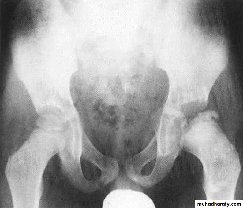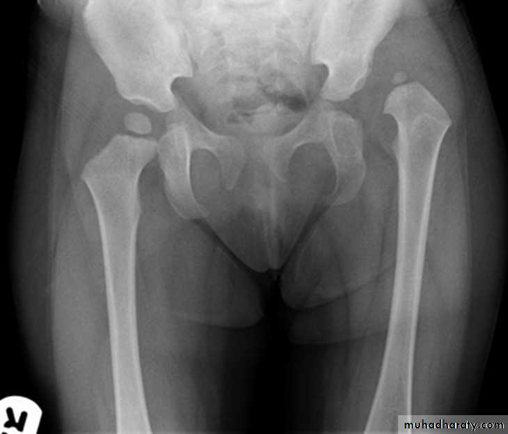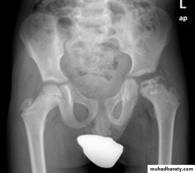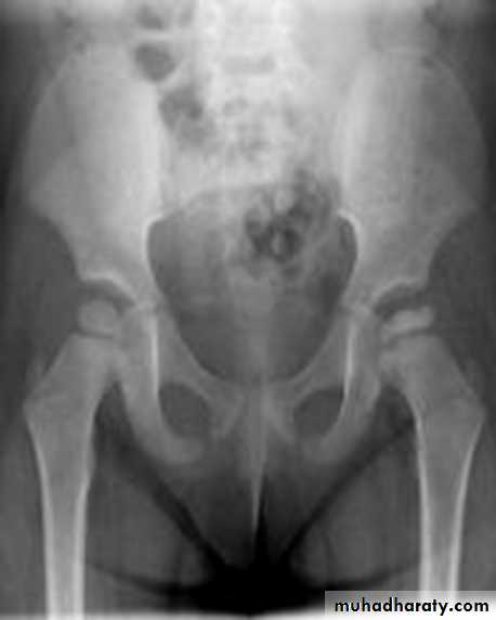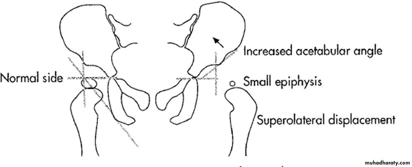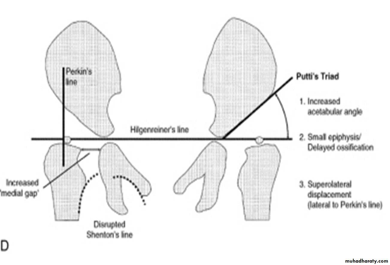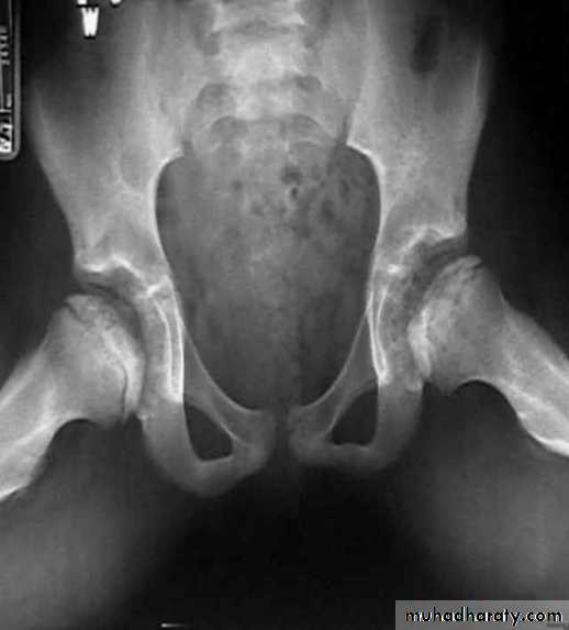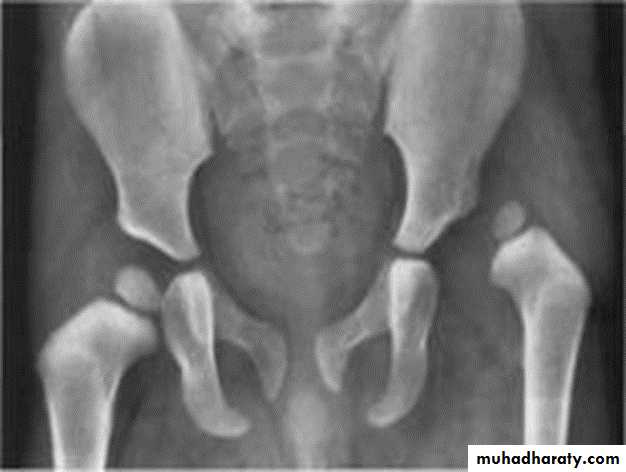 * AP veiw ( femural epiphysis are visualized ):* Superolateral displacement of proximal femur (disturbed shenton’s line )