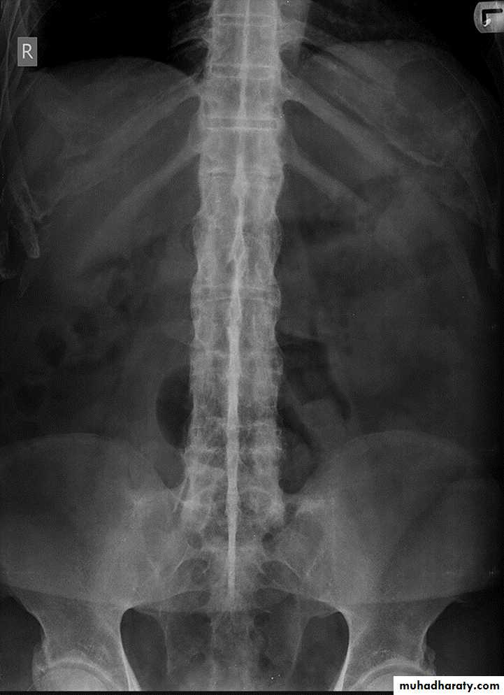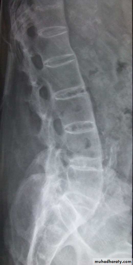phenomenon is present in the degenerative discs. Marginal osteophytes arepresent. Inferiorly the facet joints show features of degeneration and, with the increase in lordosis, the spinous processes are in contact
