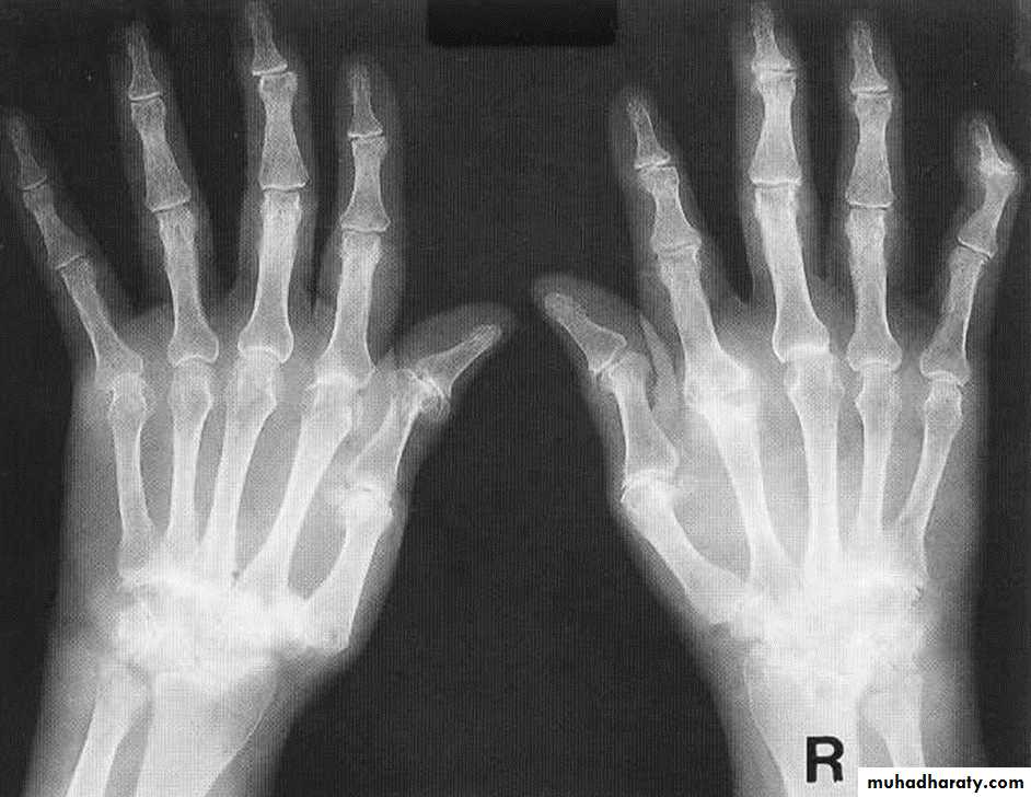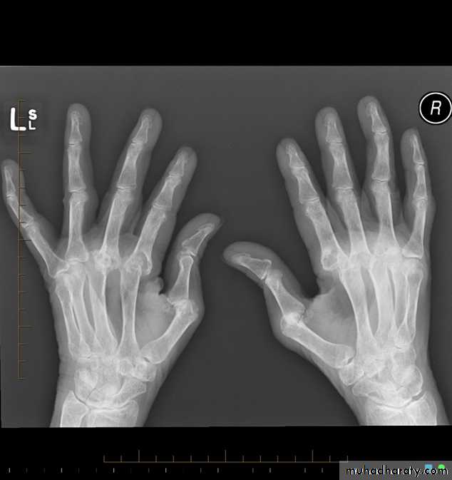 subluxation and joint narrowing at the metacarpophalangeal joints.Boutonniere deformities are present at the index and little fingers.