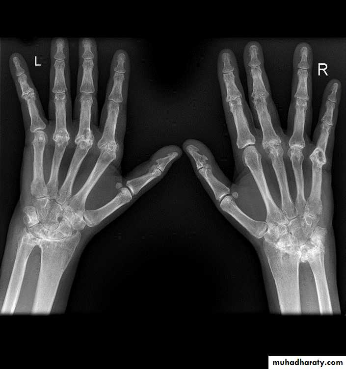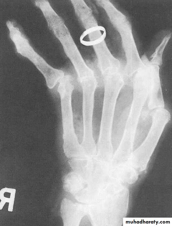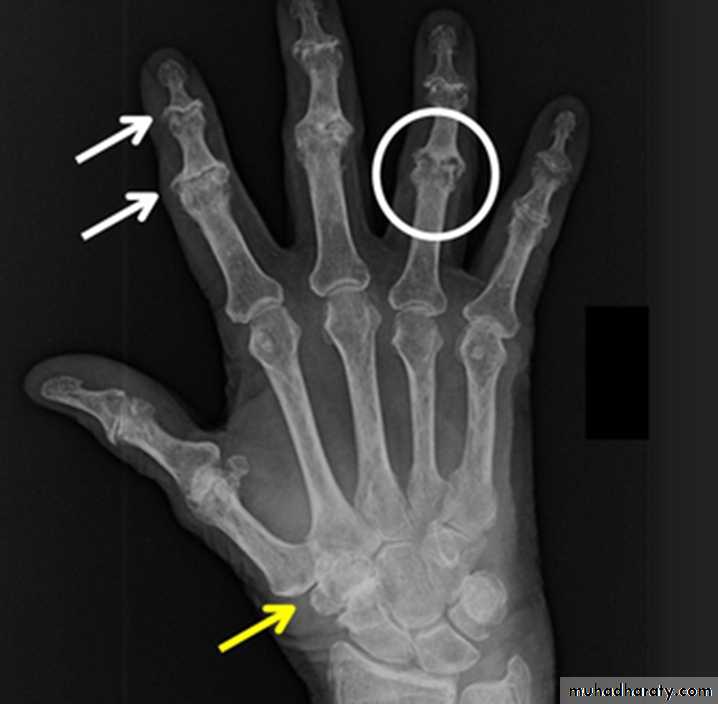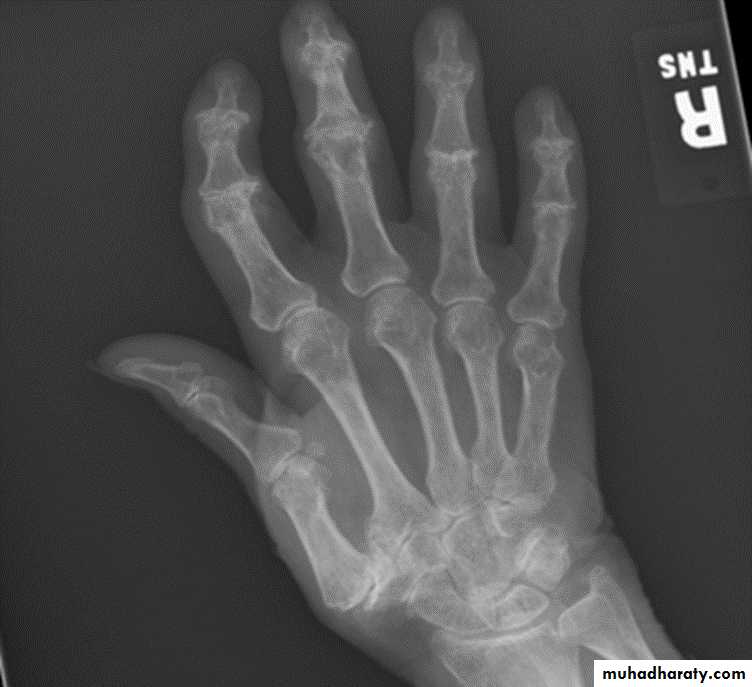 OA with superimposed inflammatory, erosive changes. Characteristically affects middle-aged women.Radiographic features: