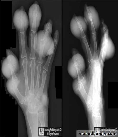* Enthesopathy is common(("whiskering of tuberosities )